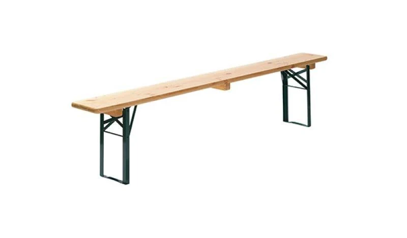 De bank is 220 cm lang met een comfortabel zitvlak van 25 cm breed. Dankzij het inklapbare onderstel is hij snel op te zetten, eenvoudig af te breken en compact op te bergen.